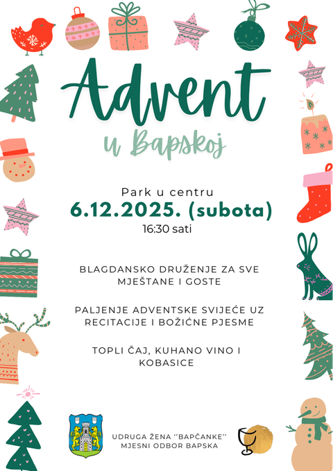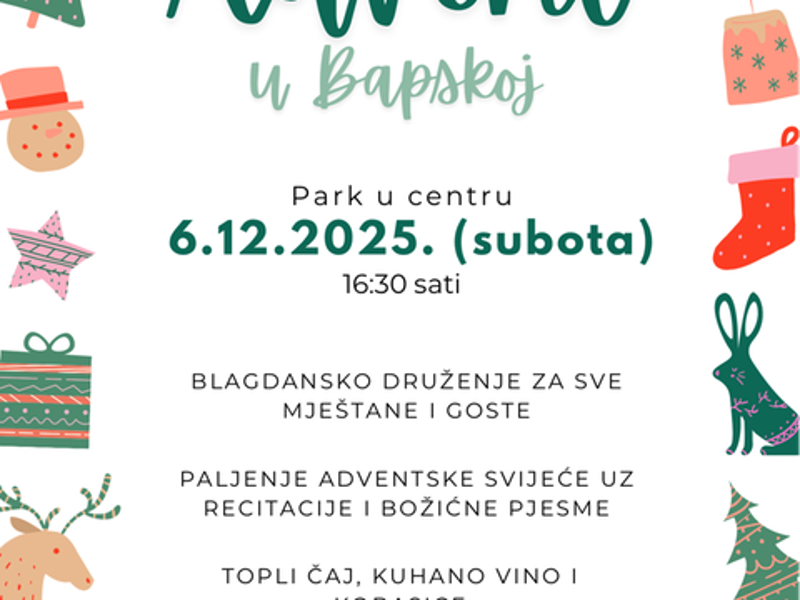 U subotu, 6. prosinca, upravo u Bapskoj započinjemo adventska događanja našeg kraja.✨🌲 Pozivamo vas da dođete, okupite se s prijateljima i susjedima da zajedno poželimo dobrodošlicu prosincu punom zajedništva.💚