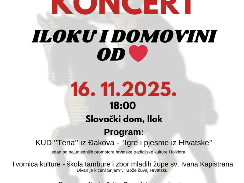 Ogranak Matice hrvatske u Iloku srdačno poziva sve građane i posjetitelje na koncert „Iloku i domovini od srca“, koji će se održati u nedjelju, 16. studenoga 2025. godine, u prostorima Slovačkog doma u Iloku, s početkom u 18:00 sati.