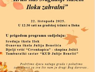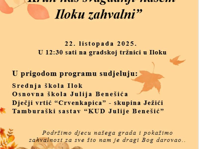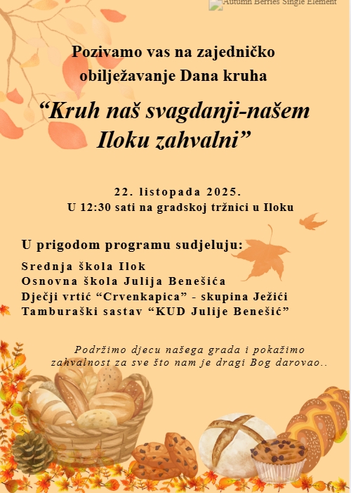 Učenici iločkih škola i vrtića srdačno pozivaju sve sugrađane i posjetitelje na svečano obilježavanje Dana kruha, koje će se održati u srijedu, 22. listopada 2025. godine, s početkom u 12:30 sati na gradskoj tržnici u Iloku.